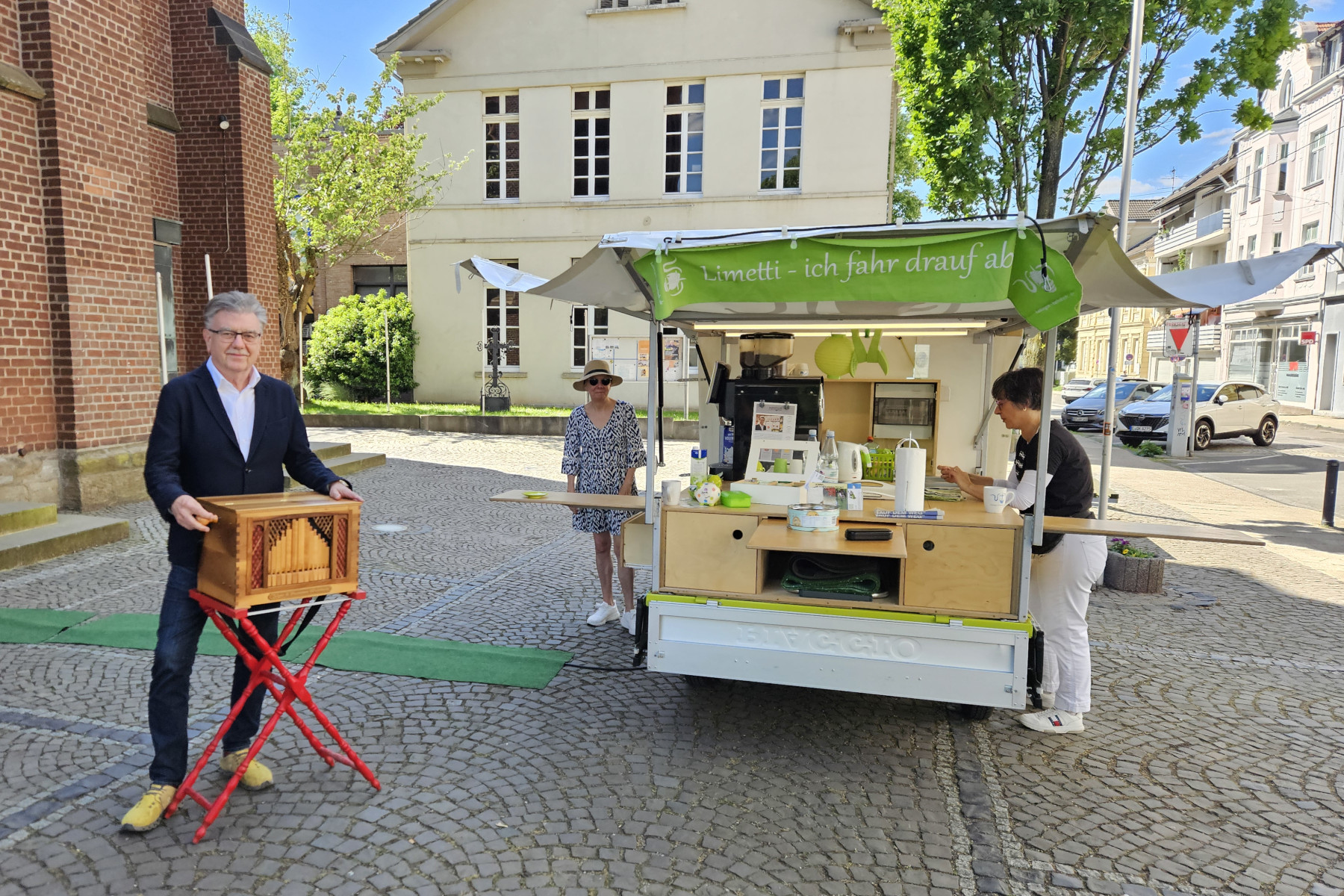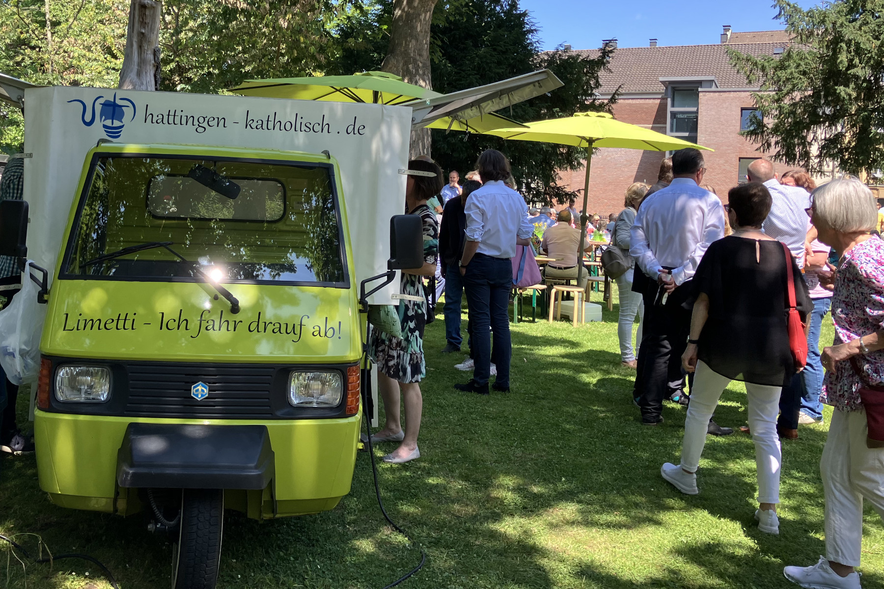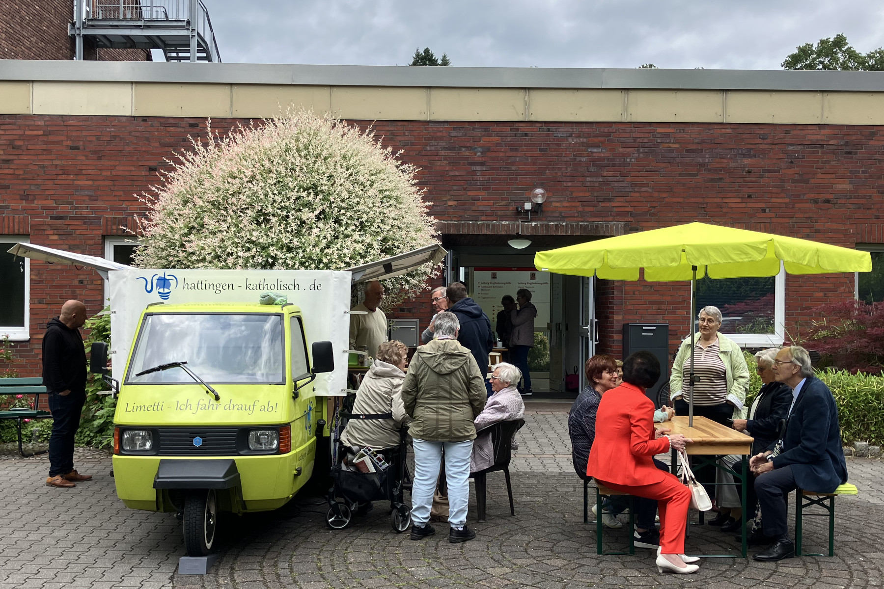 • eine Gruppe von Menschen, die mit der Ape und der Kaffeemaschine herausfahren.