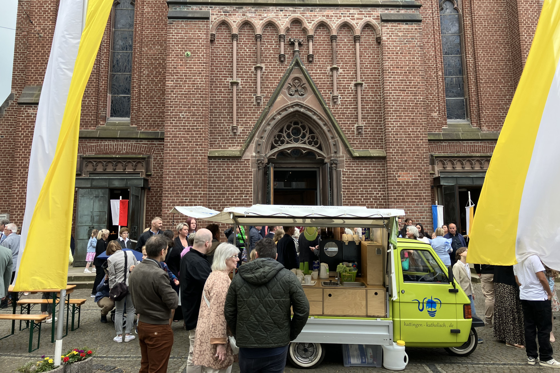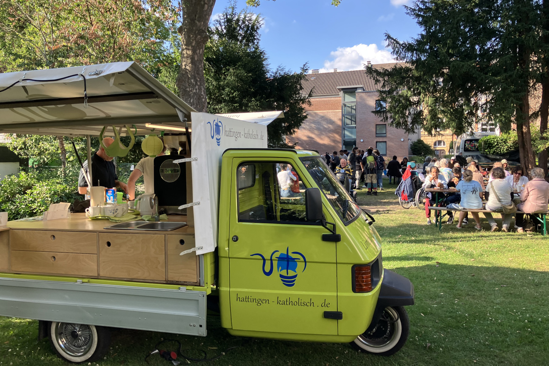 • eine Gruppe von Menschen, die mit der Ape und der Kaffeemaschine herausfahren.