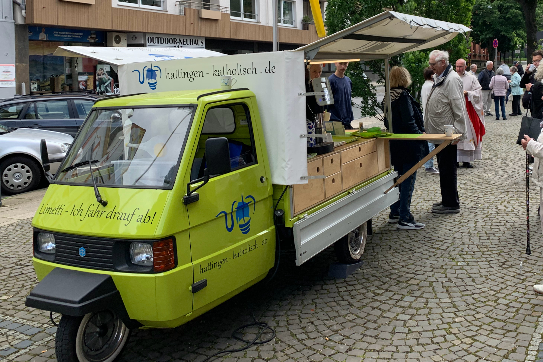 • eine Gruppe von Menschen, die mit der Ape und der Kaffeemaschine herausfahren.